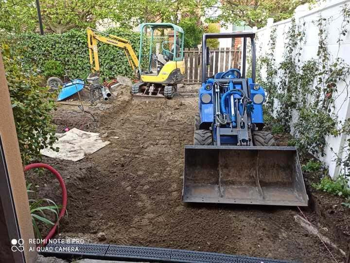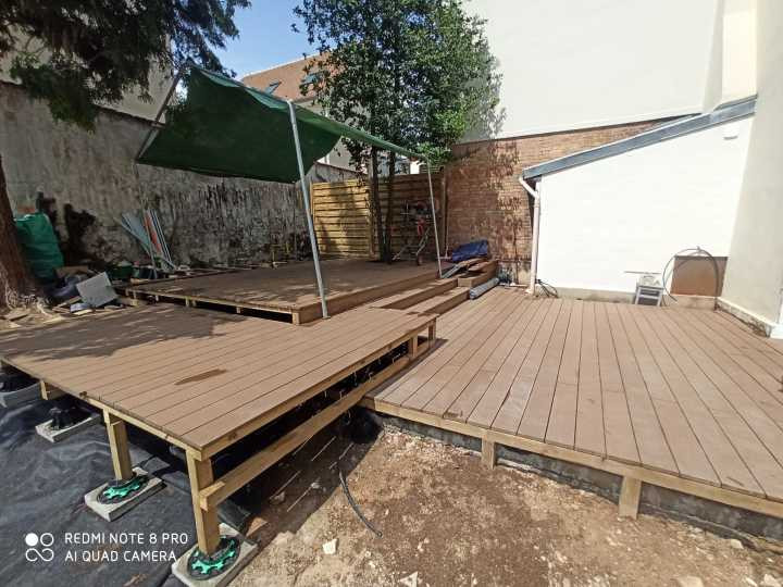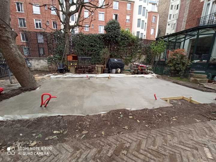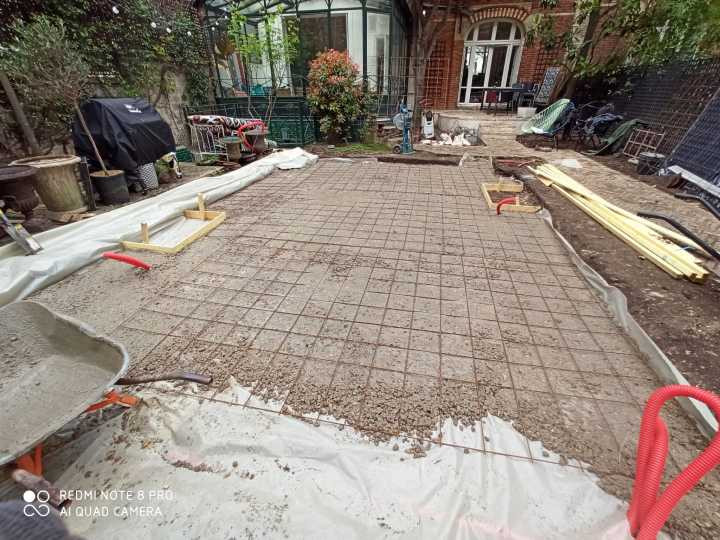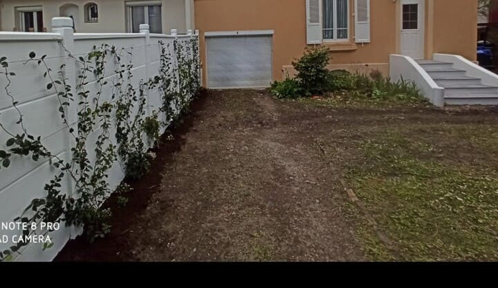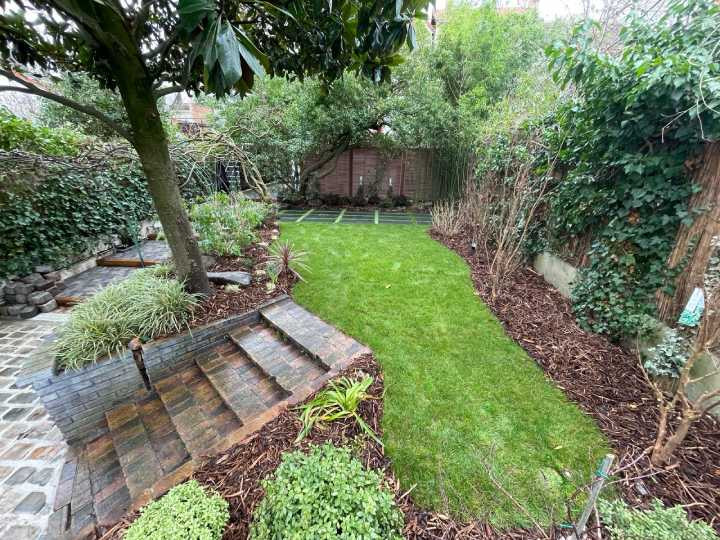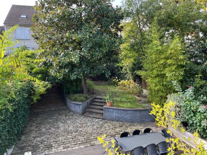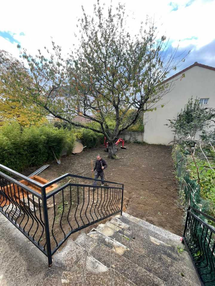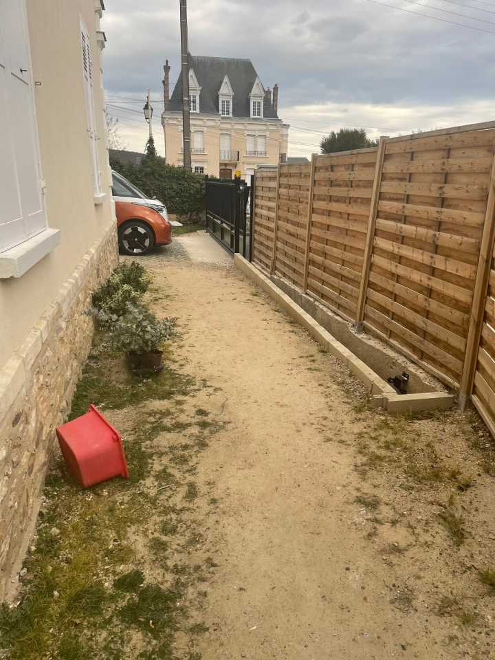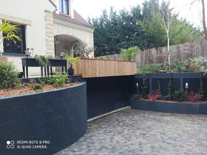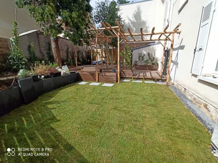 Aménagement d’un jardin de maison de ville à Cormeilles en Parisis (95). La transformation est totale ! D’un terrain nu, livré après une opération immobilière, nous avons redessiné les espaces de ce jardin en travaillant un passage en couloir étroit s’ouvrant sur un jardin arrière doté d’une pelouse et d’un potager surélevé pour le plaisir des enfants. Plus loin une terrasse en bois composite s’organise sur plusieurs niveaux et desserre la cuisine de la maison pour permettre de nouveaux espaces de vies à l’extérieur, le tout surmonté d’un chemin de pergola en châtaignier et de grimpantes pour s’abriter du soleil…