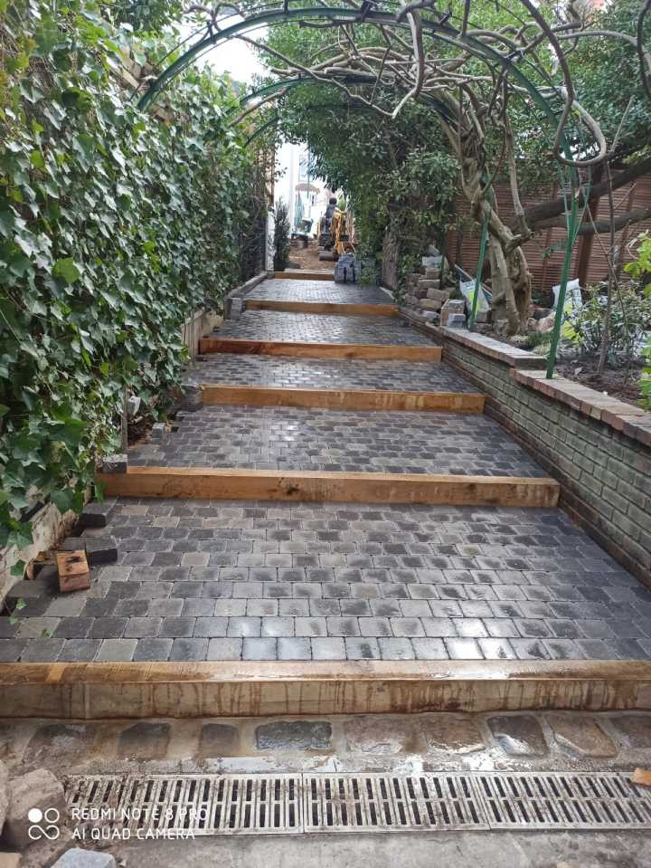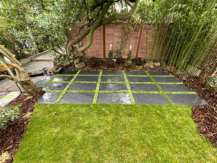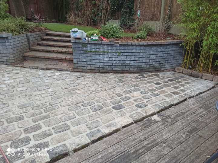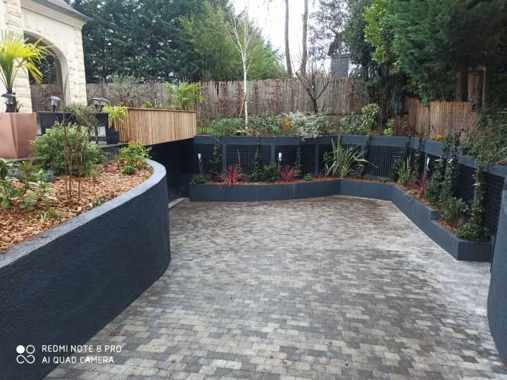 Une descente de parking à refaire à l’aide d’un pavage carrossable et drainant, des habillages de jardinière et encadré de porte fenêtre sur mesure en mélèze, terrasse et allée encollée de dalles de grès cérame effet pierre pour un style plus contemporain, reprise des massifs et plantations : le pari de reprendre ici et là quelques points de ce jardin de Garches n’était pas gagné d’avance… Le client est ravi et nous aussi !